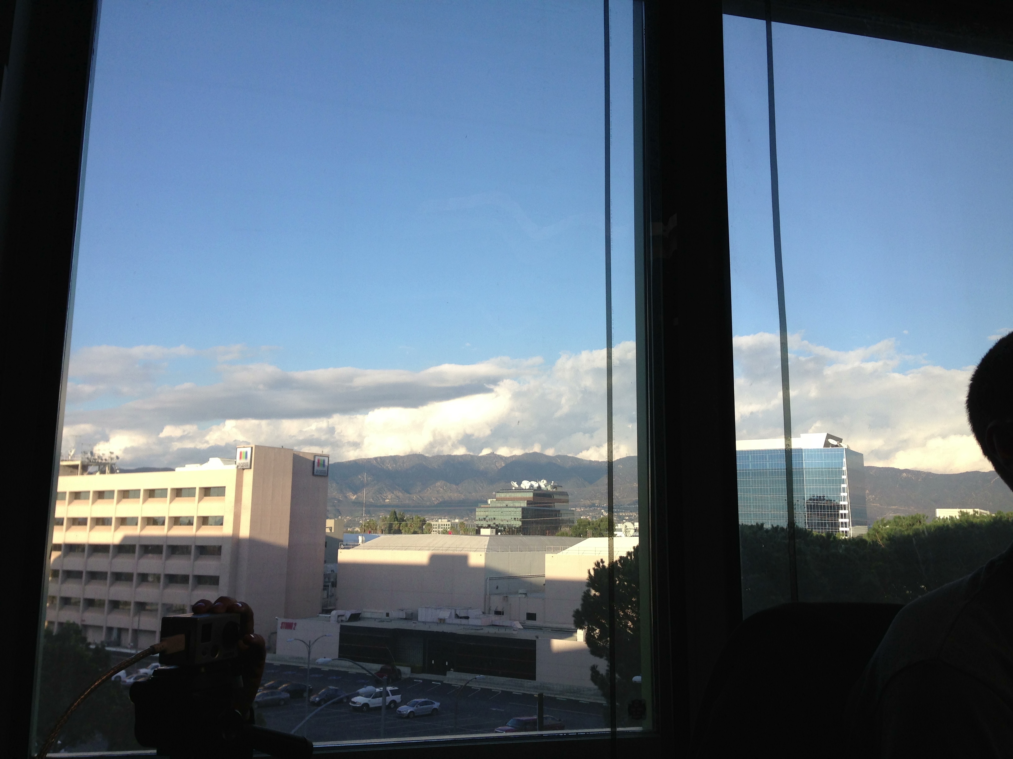 Look at the San Gabriel Mountains Range outside the window.
